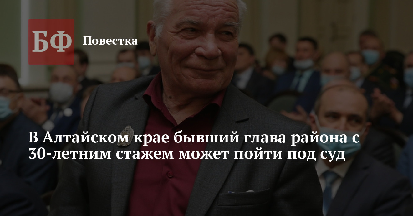 Экс-глава администрации Солтонского района Михаил Лудцев, который занимал свой пост более 30 лет, в скором времени может оказаться на скамье подсудимых. По данным источников ИА «Банкфакс», его якобы обвиняют в получении взятки в крупном размере. Как утверждают инсайдеры, преступление могло быть совершено в период, когда он еще был руководителем муниципалитета. На данный момент Лудцеву 74 года.