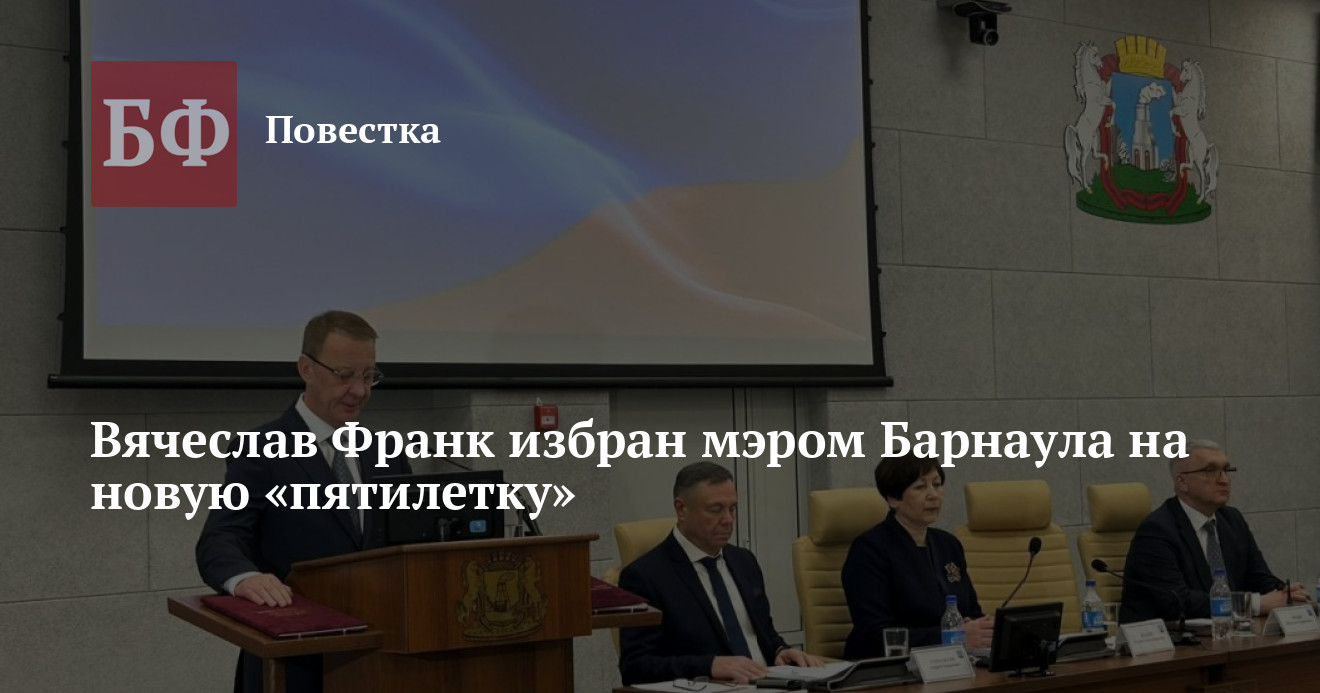 Вячеслав Франк вновь избран на должность главы Барнаула на следующий пятилетний срок. Данное решение приняло большинство депутатов городской Думы в ходе сессии 14 февраля.