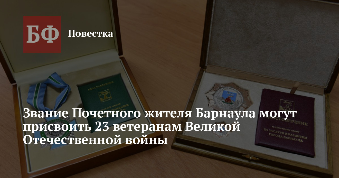 Добавим, что, по информации мэрии, звание Почетный гражданин — это степень отличия за заслуги в области хозяйственного и социально-культурного строительства города. Его присваивают совместным решением городской Думы и коллегии администрации жителям Барнаула, края, России, других государств, внесшим значительный вклад в повышение эффективности производства, в развитие науки и техники, культуры, искусства и просвещения, в охрану здоровья, жизни и прав граждан города, совершившим ратные подвиги, показавшим высокие образцы гражданского долга во имя Отечества.