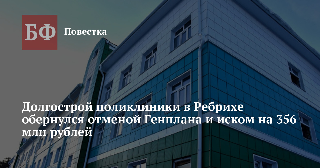 Прокуратура и Минстрой Алтайского края требуют от ООО «Компания Земпроект» возместить почти 356 млн рублей за некачественную подготовку Генерального плана Ребрихи в 2009 году, который спустя пять лет согласовали депутаты сельсовета. Поводом послужили обстоятельства, вскрывшиеся во время строительства поликлиники в райцентре. В итоге документ признали частично недействующим. В связи с этим специалистам пришлось менять проектно-сметную документацию, что повлияло на увеличение расходов для возведения медучреждения и значительную просрочку строительства. Об этом сообщила краевая прокуратура в ответе на запрос ИА «Банкфакс».
