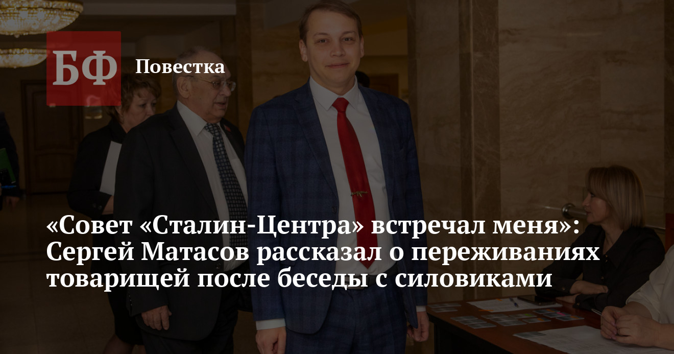 Депутат Алтайского Заксобрания Сергей Матасов подтвердил «Банкфаксу», что вчера ему приходилось беседовать с правоохранителями, и опроверг факт задержания. Он заявил, что более подробно расскажет об этой ситуации, когда сориентируется в ней — пока ему многое непонятно. Также комросс сказал, что совет «Сталин-Центра» очень волновался за него, и после разговора с силовиками собрался у депутата дома.