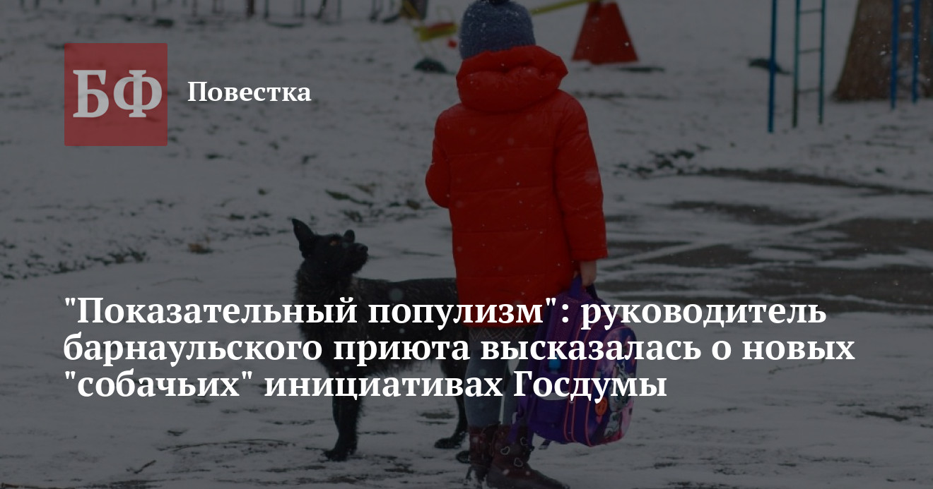 Руководитель барнаульского приюта «Ласка» Софья Куликова полагает, что новый законопроект, касающийся бродячих собак, который сейчас разрабатывает Госдума, не принесет пользы обществу. По ее мнению, это больше похоже на попытку отвлечь внимание от «неприятных вещей». В тоже время Куликова указала на меры, которые федеральные власти игнорируют, но они, на взгляд собеседницы, могли бы дать положительный эффект.