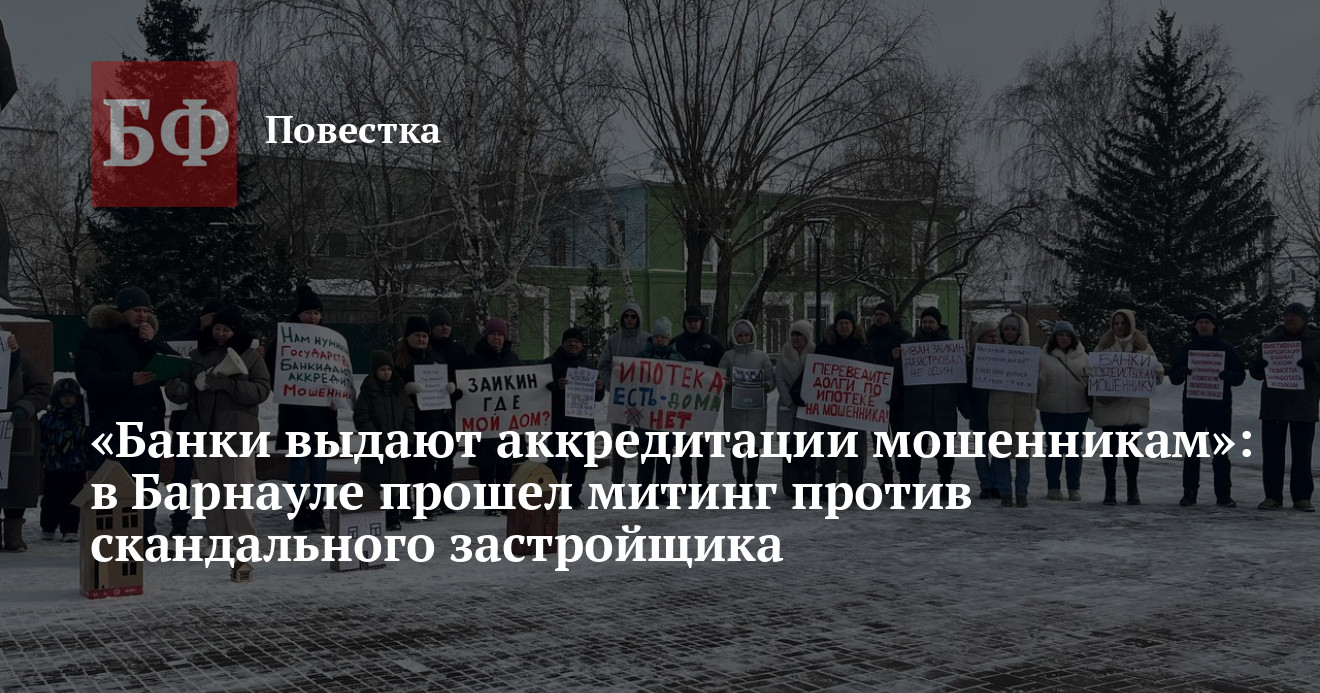 1 марта у памятника «Прощание» на площади Свободы в Барнауле состоялся согласованный митинг пострадавших от действий индивидуального предпринимателя Ивана Заикина (бренд «Малоэтажная Сибирь»). Как сообщалось ранее, бизнесмен оказывал услуги по строительству частных домов. Так, в акции приняли участие около 35 человек — молодые семьи с детьми, люди предпенсионного возраста и пенсионеры из Алтайского края, Республики Алтай и Новосибирской области. За безопасностью публичного мероприятия следили полицейские, Росгвардия и сотрудники городской мэрии.