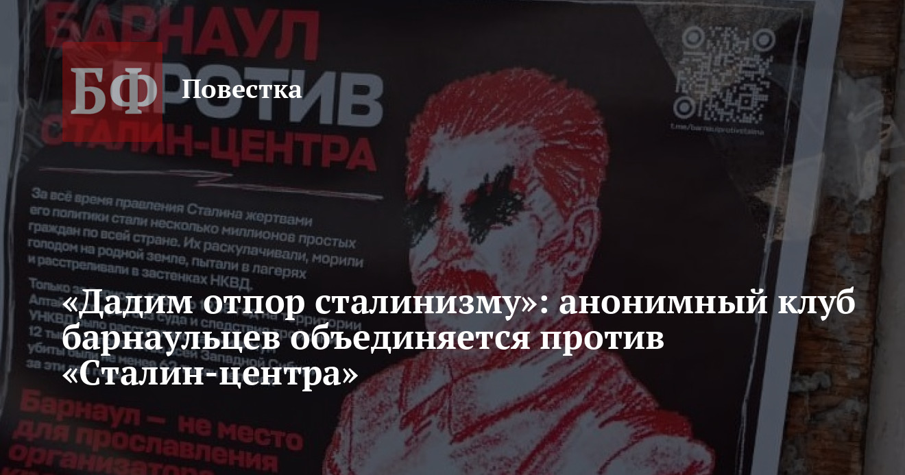 С минувших выходных на улицах Барнаула расклеивают листовки с жирной надписью «Барнаул против Сталин-центра» и портретом Иосифа Сталина с перечеркнутыми глазами. В текстовой части листовок сообщается, сколько людей в Алтайском крае и Западной Сибири были убиты в 1937—1938 годы — период наиболее массовых политических репрессий, получивший названия «большой террор» и «ежовщина», по имени тогдашнего главы НКВД Николай Ежова. А в конце листовки заявлено: «Барнаул — не место для прославления организатора кровавой бойни». QR-код, размещенный рядом с обезображенным портретом вождя, ведет на Telegram-канал «Барнаул против Сталина», у которого сейчас около 20 подписчиков.