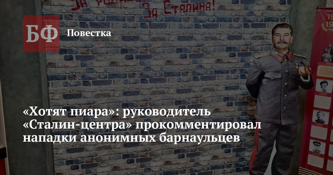 Напомним, недавно стало известно, что в Барнауле возникло движение, члены которого выступают против «прославления тирана» — Иосифа Сталина, а также против местного «Сталин-центра» — его они считают «пиар-проектом сомнительных личностей». Первым публичным действием активистов стала расклейка листовок с информацией о жертвах сталинских репрессий. У антисталинистов также есть свой Telegram-канал, у которого уже более 100 подписчиков. Там пока всего три публикации, посвященные «диктатору Сталину», а также организаторам и сотрудникам «Сталин-центра», которые его прославляют. Вместе с тем, рассуждения анстисталинистов имеют активный отклик — подписчики охотно ставят под ними эмодзи в знак согласия с выраженным мнением.