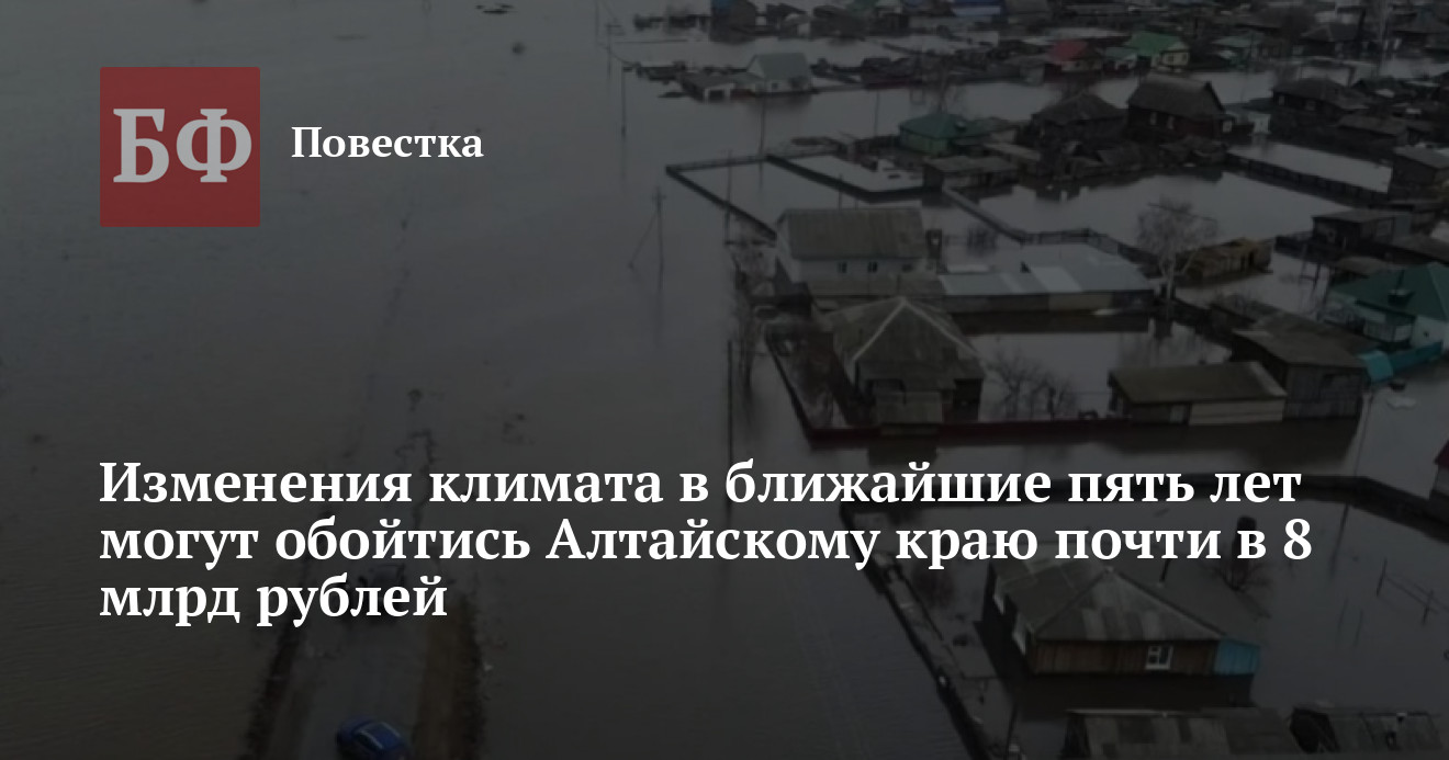 Как следует из распоряжения за подписью губернатора Виктора Томенко, характерными климатическими рисками опасного уровня для территории Алтайского края признаны: засуха и суховеи, переувлажнения, установление раннего снежного покрова, подтопление территории, оползни; сильные атмосферные осадки, град. Также в перспективе в крае могут увеличиться частота и интенсивность опасных природных явлений, вероятно возникновение волн тепла, которые влияют на появление лесных пожаров, засух, экстремальных осадков, гроз, ураганов и связанных с ними паводков и наводнений. В связи с этим власти региона полагают, что с 2024 по 2030 годы возможные последствия климатических рисков для бюджетной системы составят от 0,6 до 7,8 млрд рублей (в ценах 2022 года).