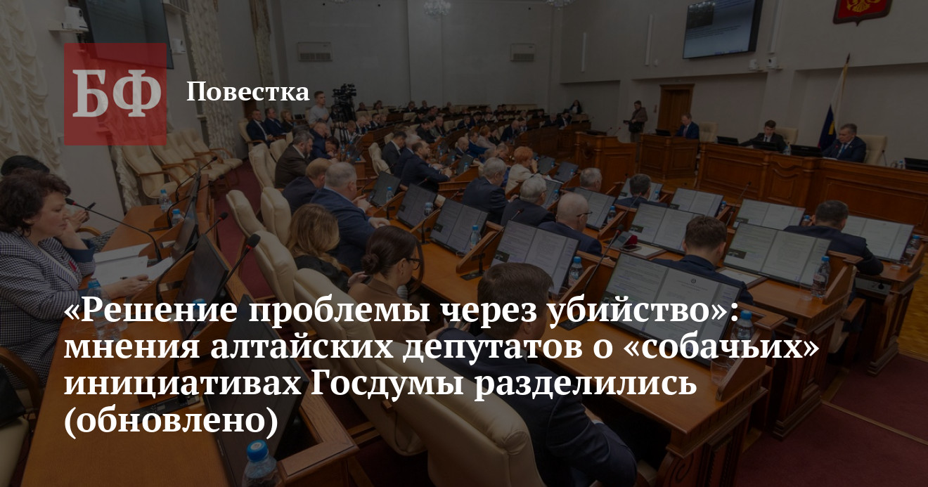 До 18 марта законодательные органы регионов должны представить в Госдуму отзывы на новый федеральный законопроект, который запрещает возвращение собак из приютов на улицу и разрешает их умерщвление по истечении определенного срока. Сейчас в Алтайском Заксобрании проходит соответствующее опросное голосование. Судя по опросу «Банкфакса» среди представителей фракций, единого мнения у депутатов на этот счет нет.