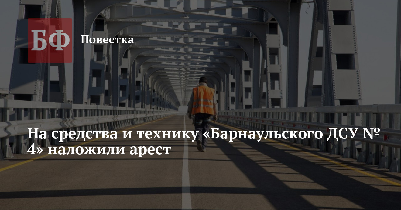 Таким образом, суд наложил арест на денежные средства «Барнаульского ДСУ № 4» на сумму более 262 млн рублей, которые «находятся и поступают» на различные счета, а также на недвижимое и движимое имущество предприятия на сумму около 355 млн рублей. В последнем случае речь идет о 44 единицах техники. Это асфальтосмесительная установка, асфальтоукладчики, бульдозеры, катки, тракторы, автогрейдеры, грузовики, легковые автомобили и т.д.
