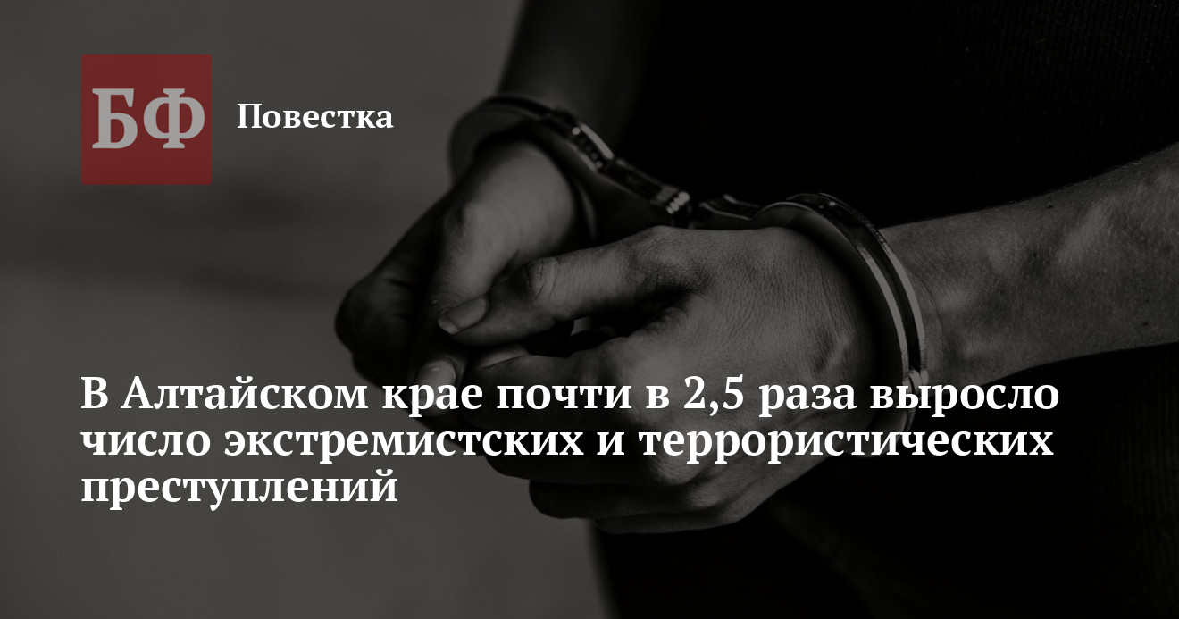 Уровень преступности в Алтайском крае в 2024 достиг 1632,7 фактов на 100 тысяч населения, и это выше, чем показатели по России (1307,7) и СФО (1532,2). Такие данные приводятся в отчете начальника ГУ МВД по Алтайскому краю Сергея Камышева, который будет представлен депутатам Заксобрания на мартовской сессии. Как сказано в документе, сильнее всего в регионе выросло число преступлений экстремистской и террористической направленности — более, чем вдвое.