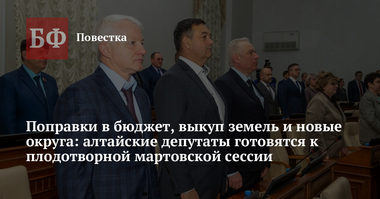 27 марта состоится 39-я сессия депутатов Алтайского краевого Законодательного Собрания восьмого созыва. Народным избранникам предстоит рассмотреть более 20 законопроектов, среди которых поправки в краевой бюджет, преобразование трех районов в муниципальные округа, повышение взносов на капремонт, выкуп сельхозземель у частных собственников региональным правительством, корректировка молодежной политики в сторону патриотического воспитания и другие.