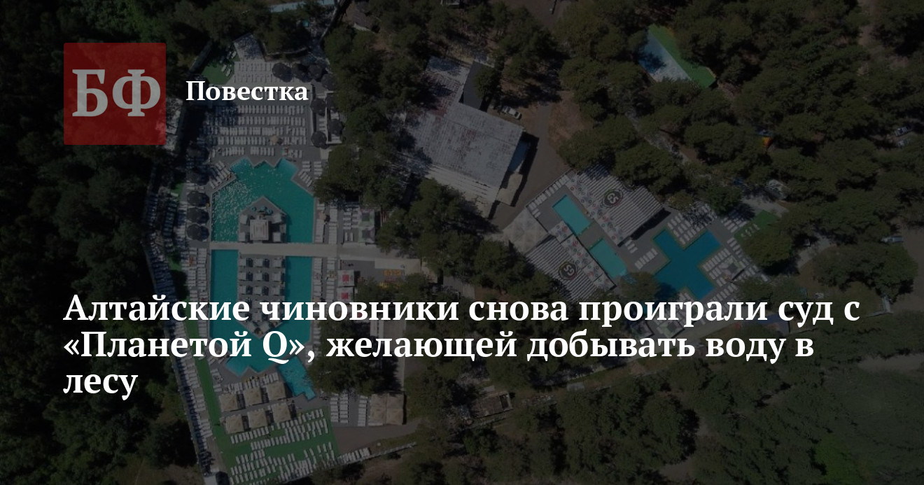 ООО «Первая строительная компания» снова выиграло суд против Минприроды Алтайского края, добиваясь от ведомства выдачи разрешения на пользование двумя лесными участками для размещения скважин. В них нуждается известный развлекательный комплекс «Планета Q» в барнаульском поселке Борзовая Заимка. Как следует из данных судебной картотеки, краевой арбитраж повторно рассмотрел дело и вынес решение в пользу фирмы.