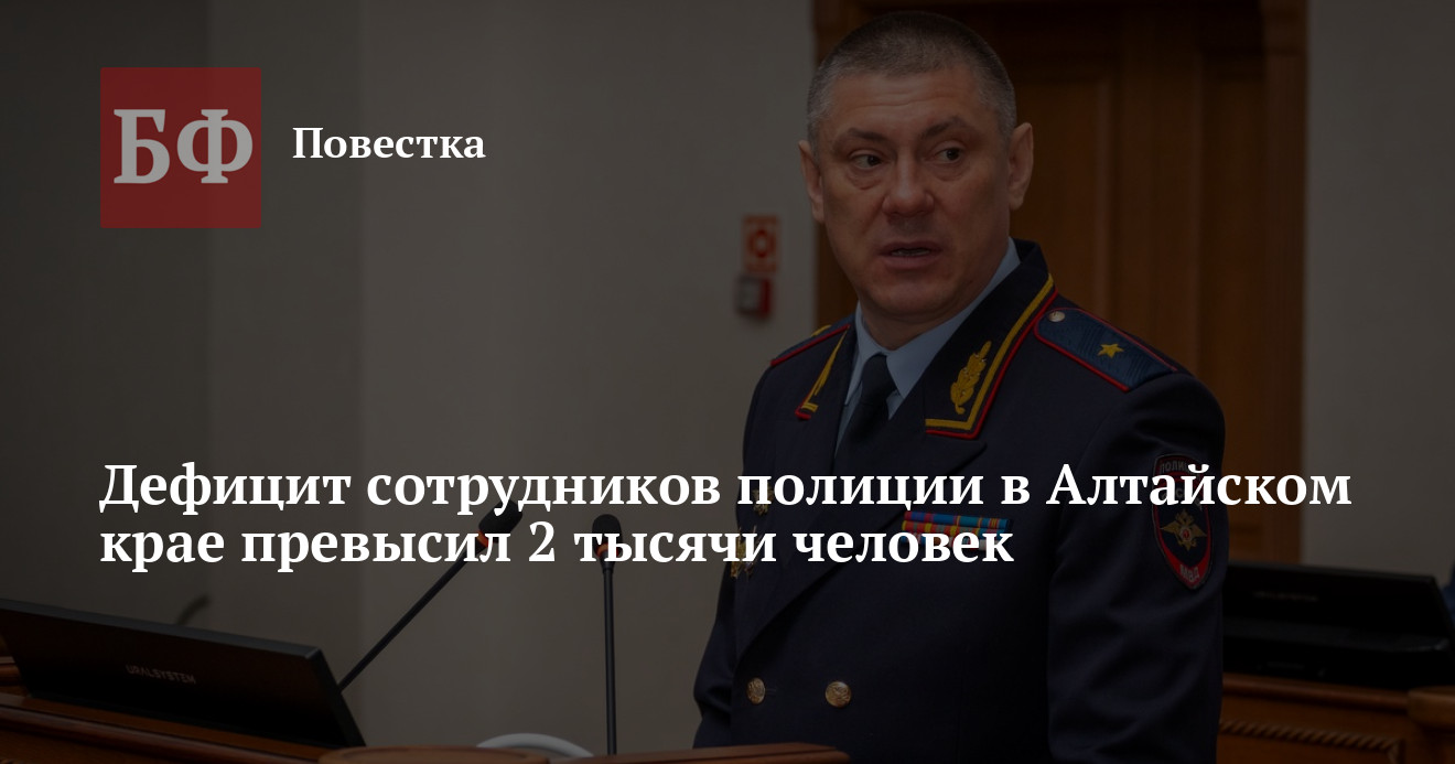 По состоянию на март 2025 года в ГУ МВД по Алтайскому краю фиксируют серьезную нехватку сотрудников полиции. Об этом 27 марта сообщил глава краевого главка МВД Сергей Камышев в рамках отчета перед депутатами Алтайского Заксобрания. По словам начальника главного управления, некомплект составляет уже более 2 тысяч человек.