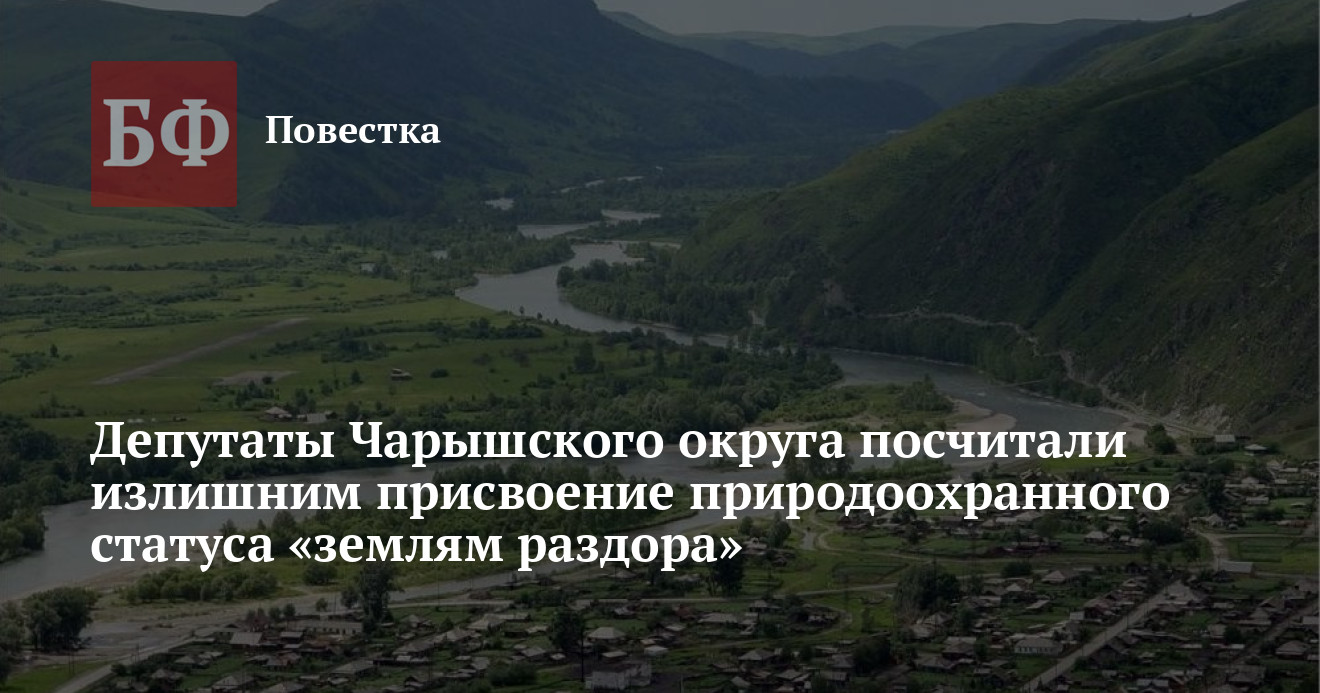 Позже министерство поясняло «Банкфаксу, что в целях разработки Схемы развития и размещения особо охраняемых природных территорий Алтайского края до 2035 года направило главе муниципалитета письмо с предложением создать ряд ООПТ в границах Чарышского округа. В частности, речь шла о памятнике природы краевого значения «Урочище Птичник» площадью 25 га. По данным министерства, депутаты муниципалитета на сессии приняли решение о нецелесообразности присвоения землям данного статуса.