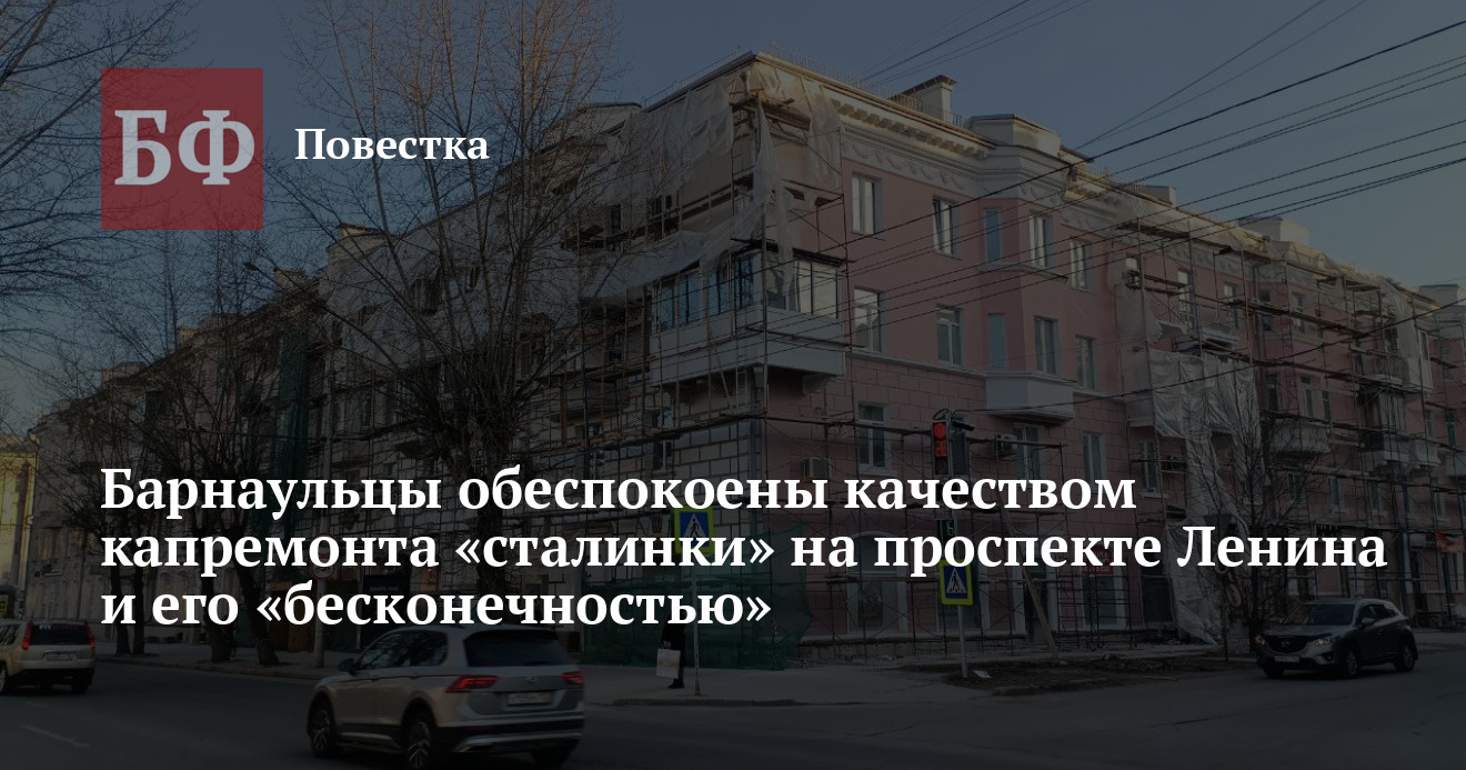 В редакцию «Банкфакса» обратились жители четырехэтажной «сталинки» на проспекте Ленина, 67а в Барнауле, обеспокоенные качеством проводимого здесь капитального ремонта, его организацией и затянутостью. Люди боятся, что их многоквартирник ждет судьба Государственного художественного музея Алтайского края.