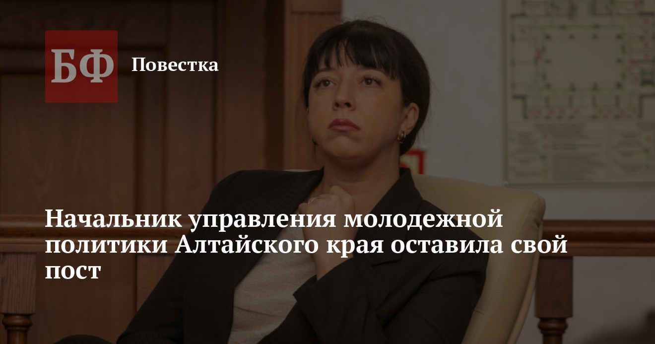 16 апреля свою должность оставила начальник управления молодежной политики и реализации программ общественного развития Алтайского края Екатерина Четошникова. Об этом сообщили в пресс-службе правительства региона.
