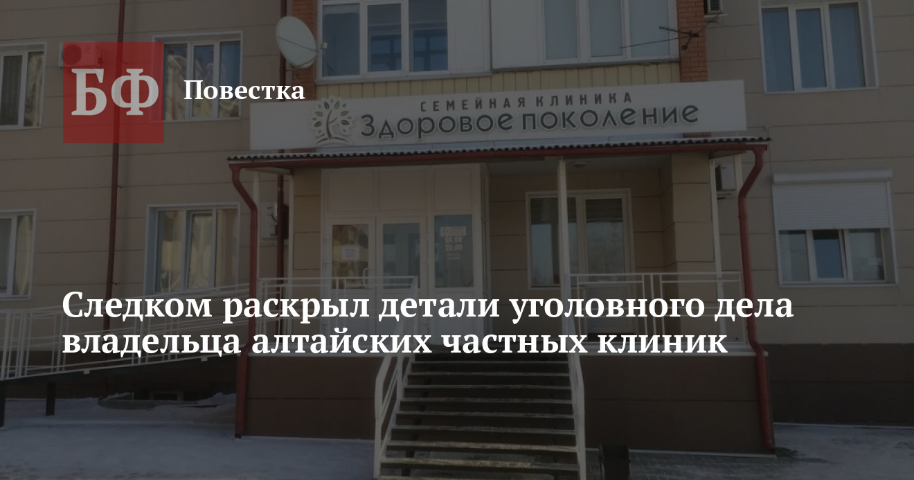 Алтайский следком подтвердил информацию о расследовании уголовного дела в отношении главврача ООО «Здоровое поколение» в Бийске Павла Бузунова. Как следует из ответа ведомства на запрос ИА «Банкфакс», ему предъявили обвинение в мошенничестве в особо крупном размере.