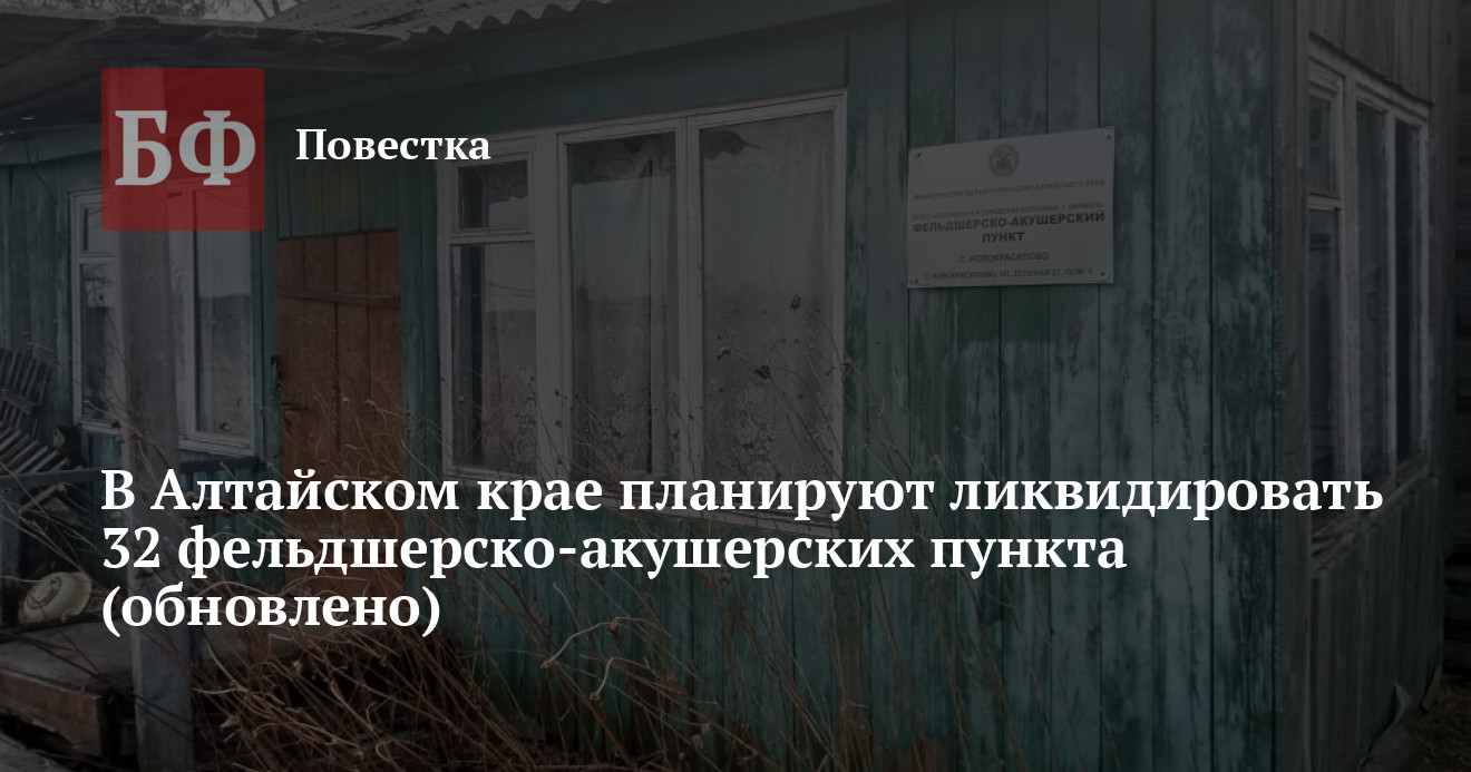 UPD 14:49: как уточнили в министерстве, ФАПы ликвидируют в Табунском, Бурлинском, Волчихинском, Первомайском, Рубцовском, Третьяковском, Заринском и Тогульском районах, а также в Кулундинском, Чарышском округах.