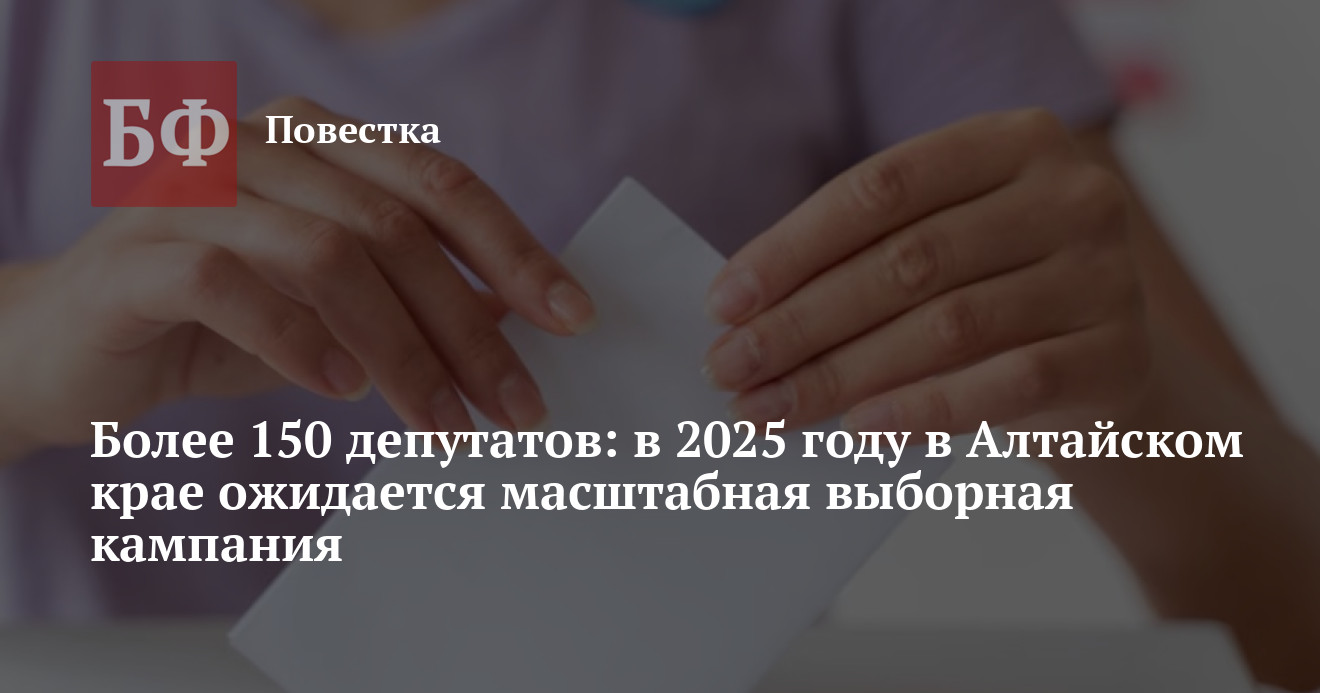 Судя по нынешним составам, в Зональном районе необходимо выбрать 16 представителей в районный совет, в Ключевском — 17, Кулундинском, Петропавловском, Солонешенском и Табунском районах — по 15 депутатов, Панкрушихинском — 18, Немецком национальном — 24 — всего 135 человек. Кроме того, в 2025 году истекает срок полномочий Славгородского Совета депутатов 28-го созыва, состоящего из 27 депутатов, состав которого тоже необходимо обновить. Таким образом, общее количество высвободившихся мандатов местного самоуправления превысит полторы сотни.