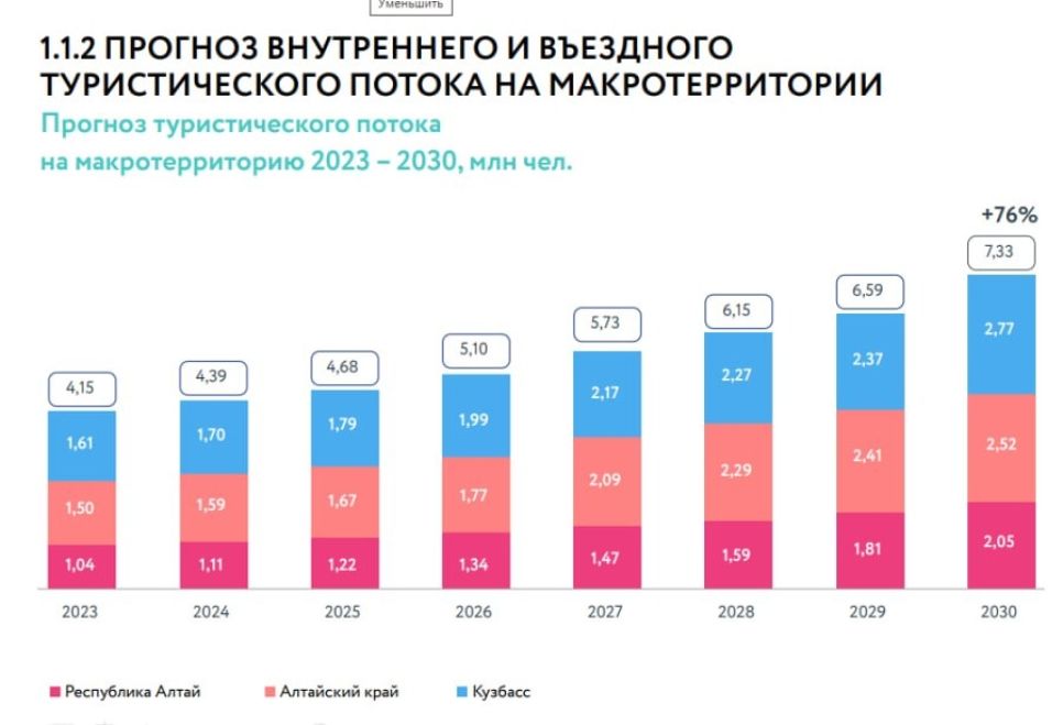 В результате реализации проектов туристический поток «Большого Алтая» к 2030 году увеличится до 7,3 млн человек, тогда как на 2024 год он составил 4,39 млн граждан. При этом наибольшее число отдыхающих через пять лет ожидается на Кузбассе — 2,7 млн человек, в Алтайский край может прибыть 2,52 млн гостей, а в Республику Алтай — 2,05 млн.