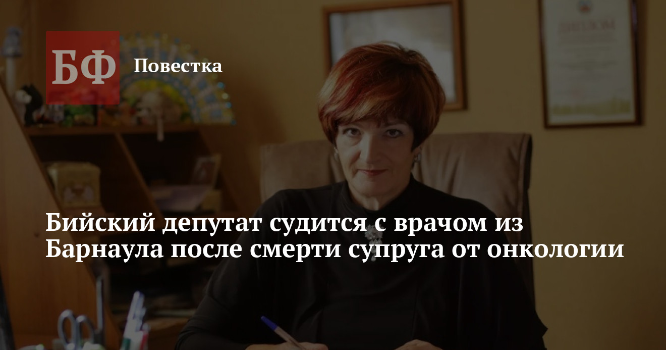В Бийском городском суде рассматривается иск депутата местной гордумы, директора МБУ «Городской Дворец культуры» Инны Рязановой в отношении горбольницы № 5 Барнаула и завотделением торакальной гнойной хирургии учреждения Вячеслава Седова. В беседе с ИА «Банкфакс» женщина рассказала, что намерена взыскать с ответчиков 4 млн рублей ущерба в связи со смертью супруга, которому, по ее мнению, не оказали своевременной помощи в стенах больницы. Хирург Вячеслав Седов в свою очередь заявил редакции, что не считает себя ответственным за случившееся, поскольку сделал все от него зависящее, и пациент был неоперабельным.