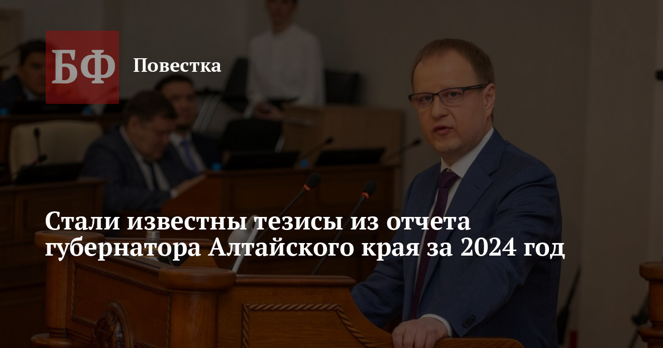 29 мая в ходе очередной сессии Алтайского Заксобрания губернатор Виктор Томенко представит отчет о деятельности правительства за 2024 год. Глава региона расскажет об устойчивом поступательном развитии региона, а также росте зарплат, увеличении индекса промышленного производства, объемов продукции сельского хозяйства и оборота розничной торговли. Кроме того, он отчитается о поддержке участников спецоперации, их семей, а также о развитии социальной сферы, следует из тезисов, опубликованных на сайте парламентского центра.