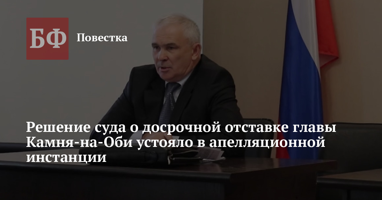 Апелляционная инстанция рассмотрела жалобу на решение о досрочном лишении полномочий главы Камня-на-Оби, спикера горсовета Евгения Чернышова в связи с коррупционными нарушениями. Как сообщили ИА «Банкфакс» в пресс-службе Алтайского краевого суда, оно осталось без изменений по ключевым положениям.
