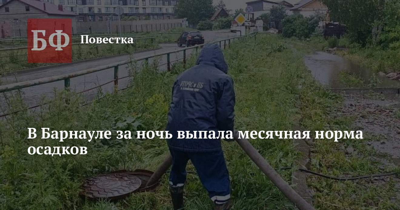 Ночью и утром 9 июня в Барнауле шел проливной дождь такой силы, что за считанные часы выпала месячная норма осадков. Данную информацию «Банкфаксу» подтвердили в алтайском Гидрометцентре. При этом в крае до сих пор устраняют последствия стихии.