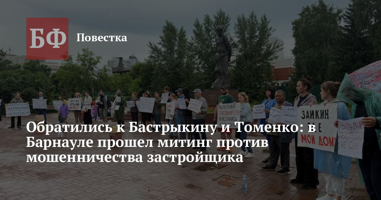 6 июля в Барнауле прошел митинг против местного застройщика, директора ООО «Малоэтажная Сибирь» Ивана Заикина. Это уже вторая в городе протестная акция семей, которым предприниматель обещал возвести частные дома, однако этого не сделал. Пострадавшие записали обращения к председателю СК РФ Александру Бастрыкину и губернатору Алтайского края Виктору Томенко с просьбой защитить обманутых граждан, сообщила «Банкфаксу» участница мероприятия Виктория Морозова. Между тем в Алтайском краевом суде сообщили, что опального бизнесмена удалось вернуть в СИЗО на время расследования уголовного дела.