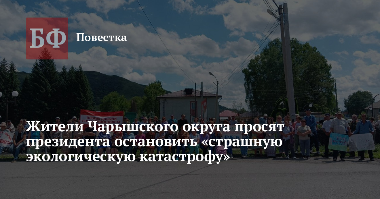 13 июля в окружном центре Чарышское прошел митинг против работы золотодобытчиков и планов инвесторов по возведению туристического комплекса в муниципалитете. Протестная акция объединила 235 митингующих, часть из которых даже прибыла из соседних районов, чтобы поддержать земляков в борьбе за сохранение природы. За помощью в изгнании бизнесменов, которые якобы губят живописные локации, местные жители обратились к президенту России Владимиру Путину.