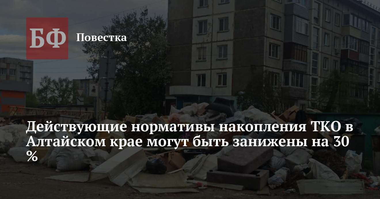 Норматив накопления ТКО - это объем мусора, который выбрасывает один человек в месяц. Нынешние нормативы действуют в Алтайском крае с 1 июля 2021 года. Для проживающих в индивидуальных жилых домах это 0,1250 кубометров в месяц, а для жителей многоквартирных домов - 0,1209 кубометров месяц.