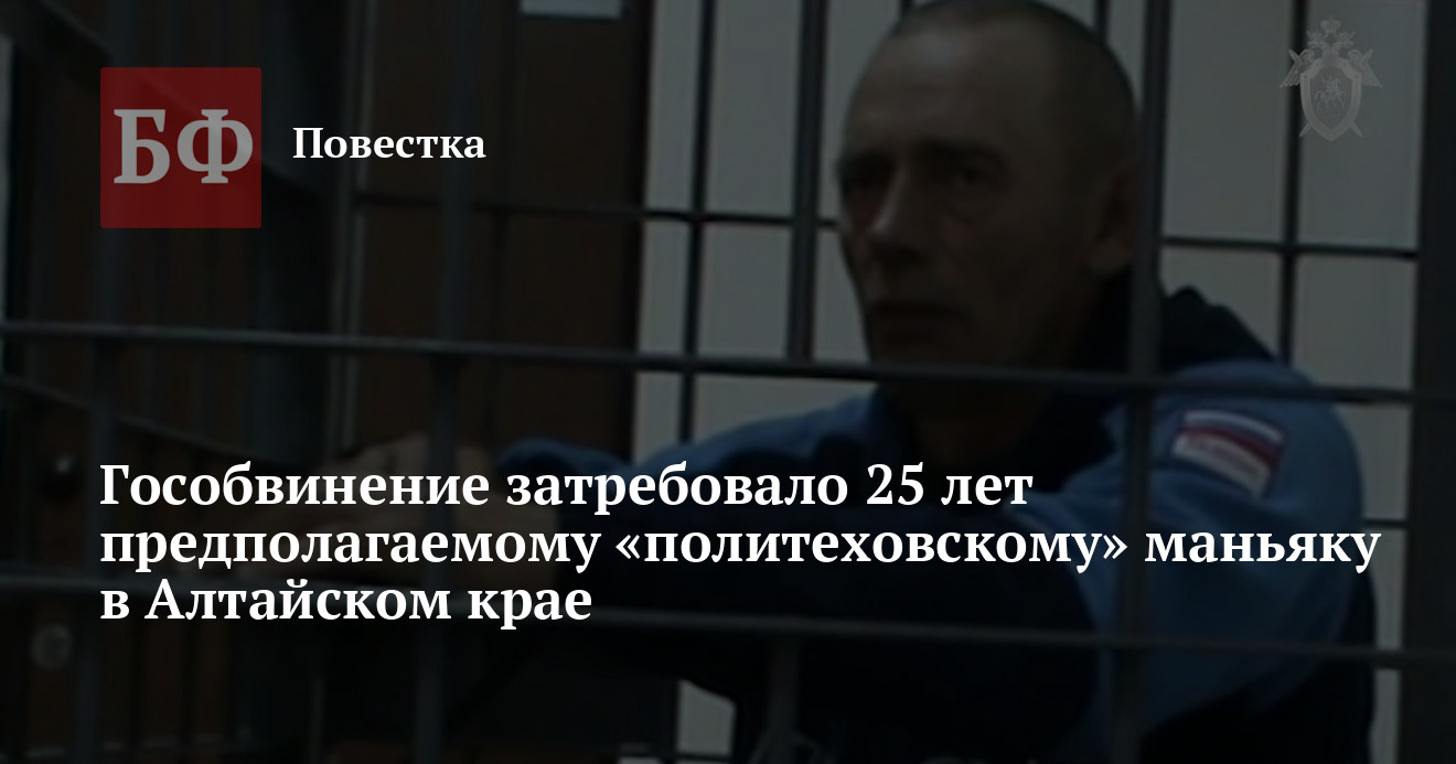 В Калманском районном суде начались прения сторон по делу предполагаемого «политеховского» маньяка Виталия Манишина. Во время своего выступления на заседании гособвинение запросило максимальное наказание для подсудимого в виде 25 лет заключения, сообщили в прокуратуре Алтайского края.