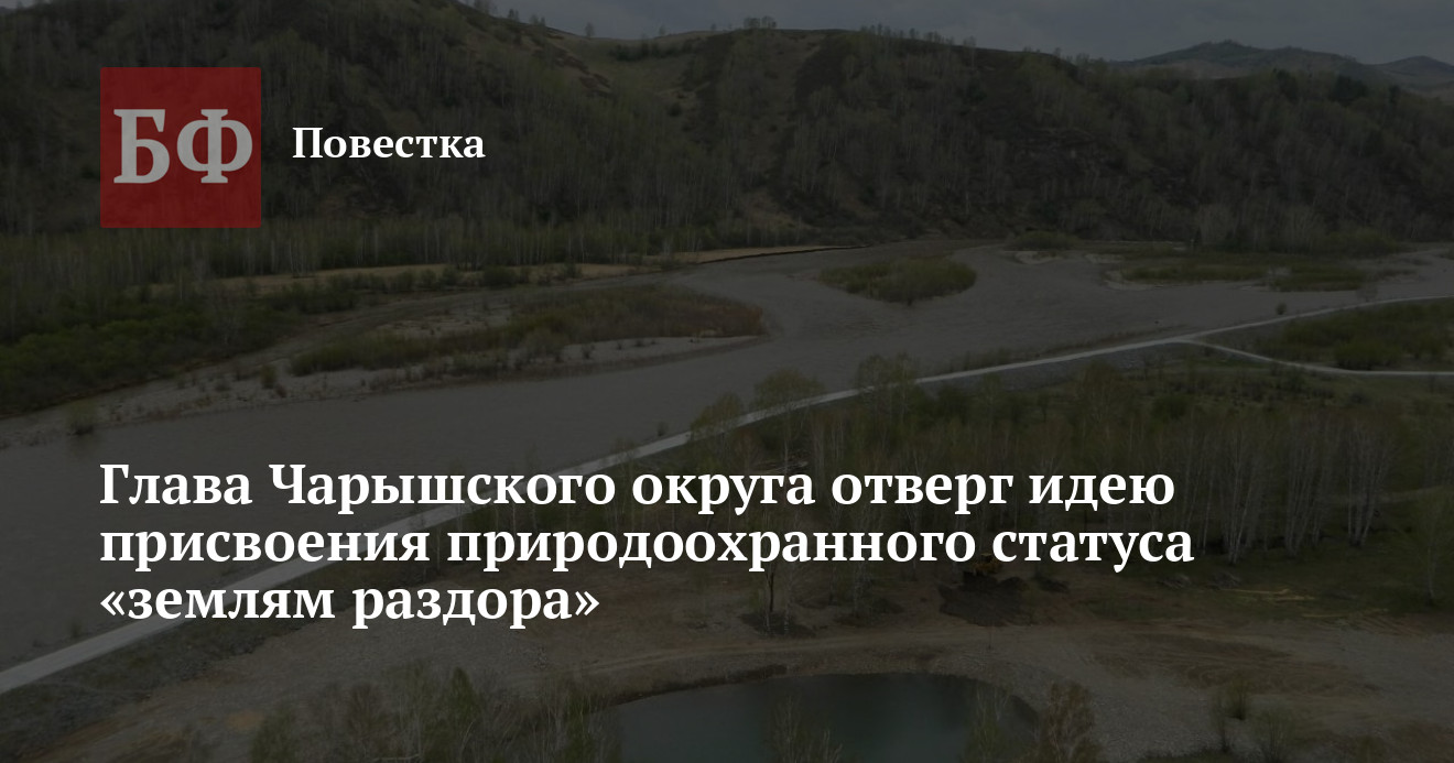 Свое видеообращение глава муниципального округа записал из Красного Партизана, поднявшись на гору, откуда просматривались территории, вызывающие споры и конфликты - дамба, водозабор и частные земли ООО «Чарыш партнерс», которое планирует построить на них туркомплекс. Александр Ездин напомнил, что 13 июля в Чарышском состоялся митинг, на котором участники выразили недоверие главе и депутатам, а также потребовали «активных действий» для наделения урочищ «Птичник», «Первый взрыв», «Озеро Синенькое», «Широкий лог» статусом особо охраняемой природной территории (ООПТ).
