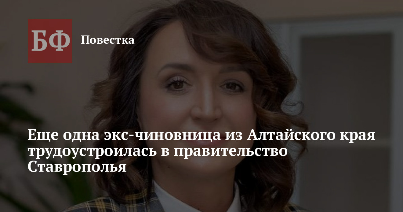 25 августа стало известно о том, что бывший заместитель министра социальной защиты Алтайского края Оксана Кудинова, которая покинула свой пост в январе текущего года, получила должность в правительстве Ставропольского края. Теперь она работает в команде бывшего министра спорта региона Ивана Нифонтова, который недавно занял там кресло вице-губернатора, следует из документа, копия которого имеется в распоряжении ИА «Банкфакс».