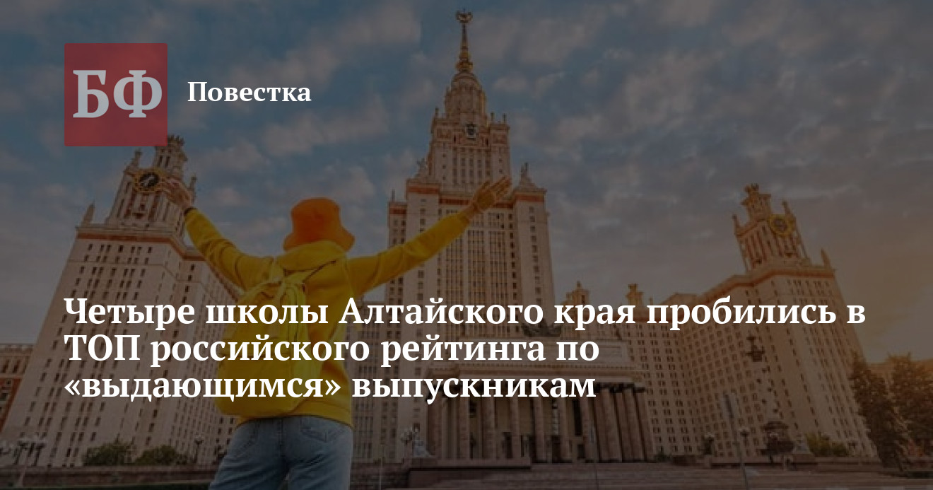 Так, рейтинг школ по количеству выпускников, поступивших в ведущие вузы России, состоит из 500 образовательных заведений. Лидером исследования стал московский лицей НИУ ВШЭ (балл - 100, доля бюджетников – 19,5 %, платников – 65,4 %, олимпиадников - 15,1 %). В данный рейтинг также включили четыре школы Алтайского края. Речь идет о гимназии № 42 Барнаула (252-е место, 67 баллов, доля бюджетников – 54,4 %, платников – 36,7 %, олимпиадников – 8,9 %), Алтайский краевой педагогический лицей-интернат (330-е место,56 баллов, доля бюджетников – 67,6 %, платников – 24,3 %, олимпиадников – 8,1 %), Бийский лицей-интернат (339-е место, 56 баллов, доля бюджетников – 49,3 %, платников – 32,9 %, олимпиадников – 17,8 %), а также лицей № 124 Барнаула (340-е место, 56 баллов, доля бюджетников – 71,4 %, платников – 17,1 %, олимпиадников – 11,4 %).