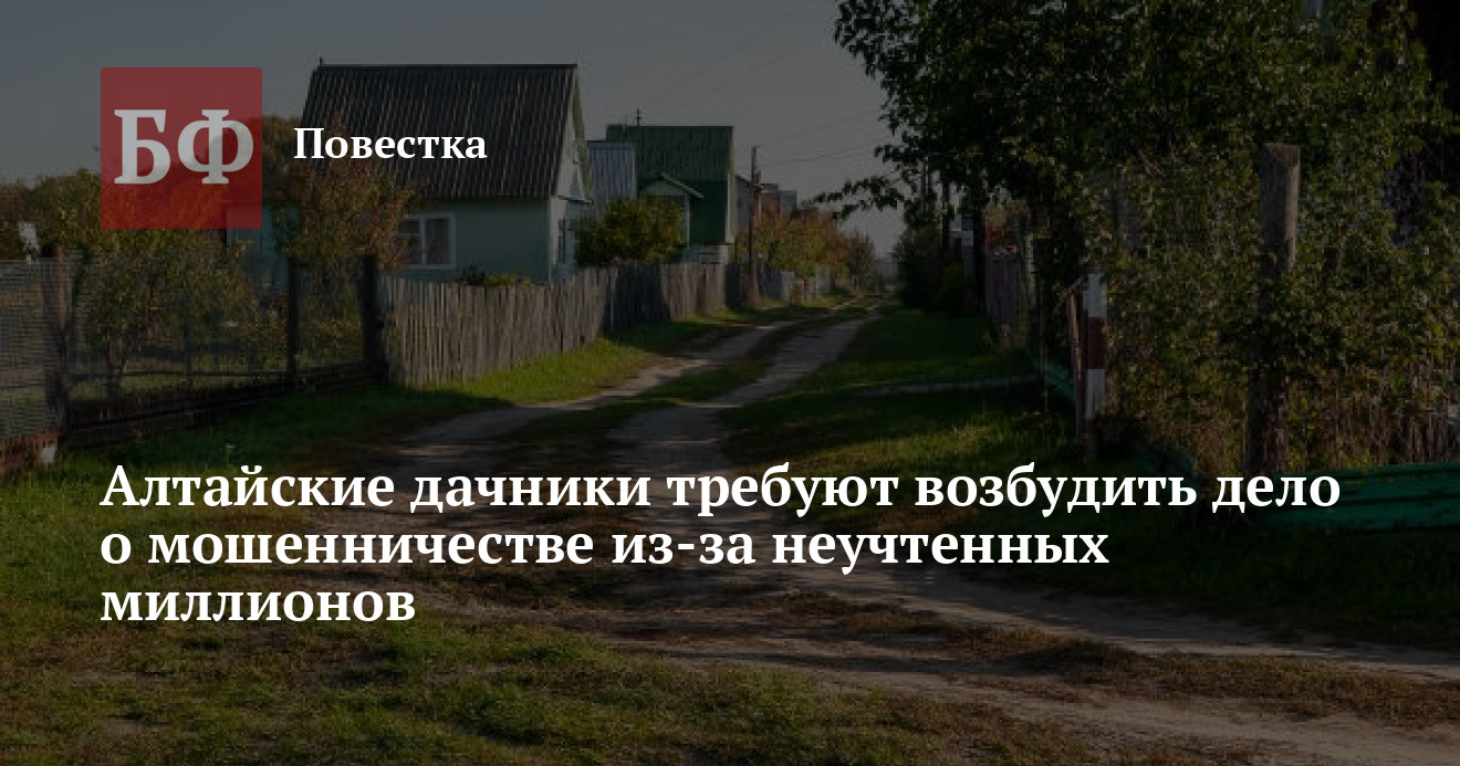 В редакцию «Банкфакса» обратились участники инициативной группы, которые не согласны с результатами проверки о предполагаемом мошенничестве в СНТ «Химик-1» в Яровом. Они пришли к выводу, что за три последних года больше 8 млн рублей могли быть израсходованы «мутным» образом, при этом правоохранительные органы отказывают в возбуждении уголовного дела. В связи с этим дачники обратились в прокуратуру Алтайского края.