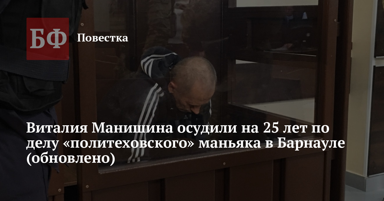 1 октября в Железнодорожном районном суде Барнаула огласили приговор предполагаемому барнаульскому маньяку Виталию Манишину. Его обвиняли в серии убийств девушек, среди которых были абитуриентки АлтГТУ им. Ползунова, а также в убийстве жительницы села Зеленая Дубрава, произошедшего в 1989 году. Его признали виновным и приговорили к 25 годам лишения свободы, передает корреспондент ИА «Банкфакс» из зала суда.