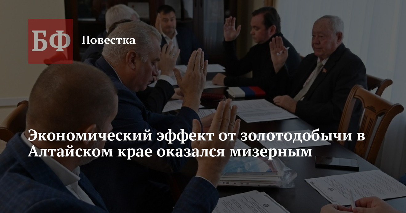 На заседании комитета АКЗС по промышленности, предпринимательству и туризму была зачитана информация аудитора Счетной палаты Алтайского края Татьяны Миркиной о результатах экспертно-аналитического мероприятия, касающегося оценки экономического эффекта от добычи россыпного золота в регионе. Ранее провести такое экспертно-аналитическое мероприятие СП поручили парламентарии.