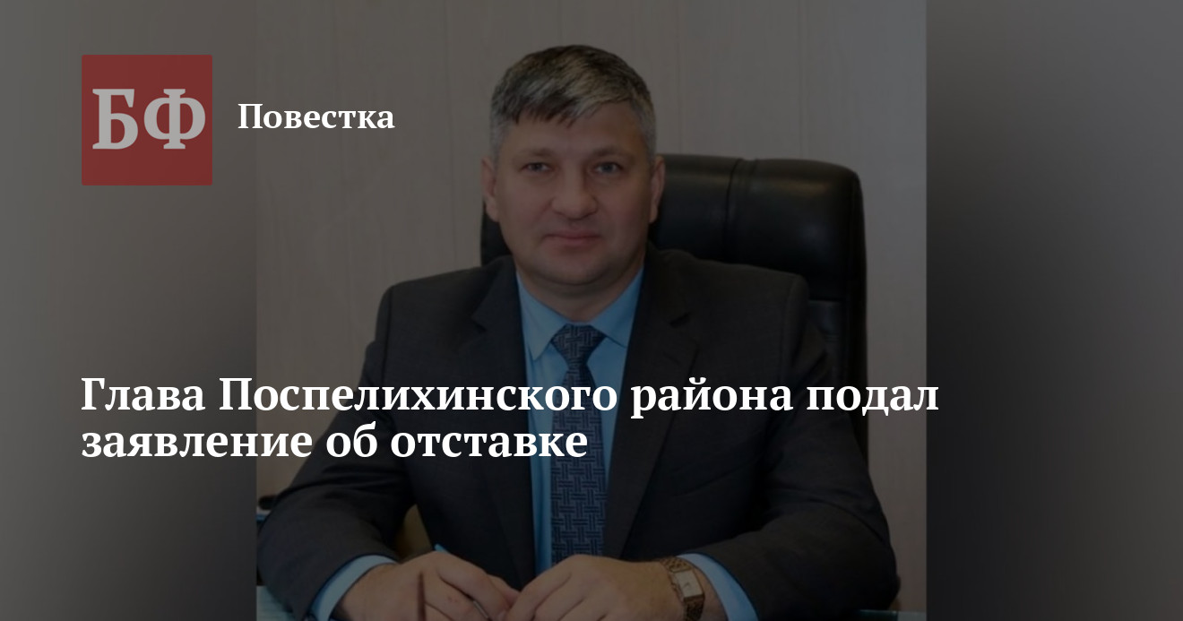 По информации депутатов Поспелихинского районного Совета, первым вопросом повестки сессии значится заявление главы муниципалитета Игоря Башмакова «о досрочном сложении полномочий в связи с отставкой по собственному желанию». Вопрос внесен на рассмотрение депутатов внепланово. Еще утром председатель райсовета Татьяна Шапрафеева заявила «Банкфаксу», что данный вопрос в повестке пока не значится. Однако она не исключала, что его включение в список возможно. Заседание пройдет 27 октября в закрытом режиме.