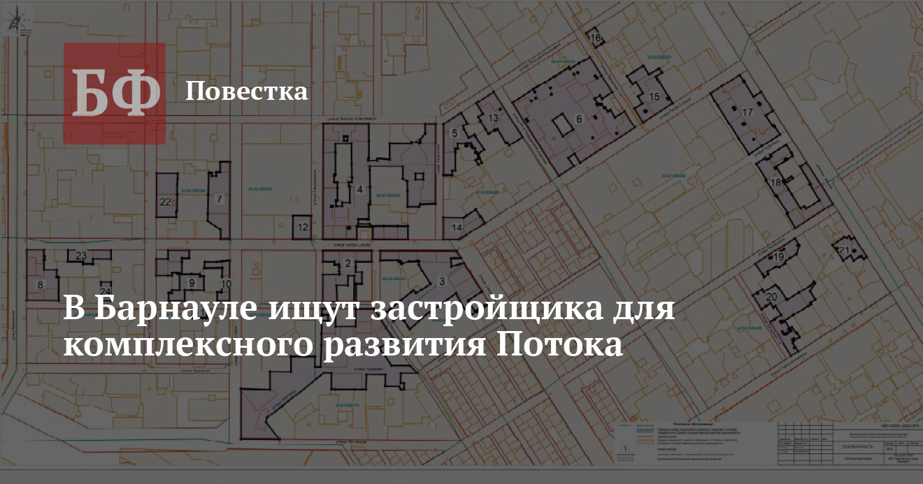 27 октября администрация Барнаула начала искать организацию для заключения договора о комплексном развитии территории жилой застройки Барнаула в границах микрорайона Поток. Общая площадь территории составила 30,3 га. Начальная цена без учета НДС составила 36,4 млн рублей, а шаг аукциона – около 1 млн рублей. Подать заявку можно до 24 ноября. Итоги подведут 27 ноября.