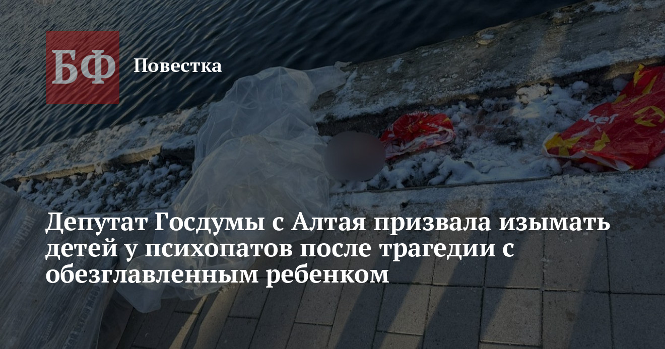Резонансное убийство шестилетнего мальчика в Москве, останки которого были найдены в Гольяновском пруду, вызвало бурную реакцию в Госдуме. Уроженка Алтайского края, председатель комитета ГД по защите семьи, вопросам отцовства, материнства и детства Нина Останина выступила с призывом изымать детей из семей, где родители страдают психическими заболеваниями. Между тем она потребовала провести детальное расследования трагедии для установления полной картины произошедшего и определения ответственности всех причастных служб.