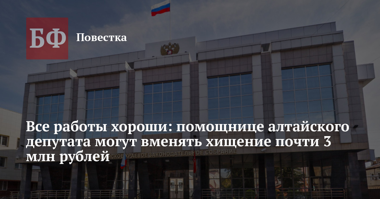 Введенные в заблуждение сотрудники АКЗС на основании фиктивных документов необоснованно и незаконно перечисляли Кербер деньги из бюджета Алтайского края. По сведениям собеседников, с 2021-го по 2025 год она могла получить не менее 2,9 млн рублей, которые якобы похитила, чем причинила региональному парламенту имущественный ущерб в особо крупном размере.