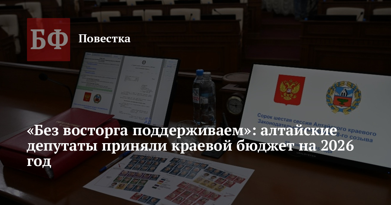 27 ноября состоялась очередная сессия Алтайского Заксобрания, на которой приняли главный финансовый документ региона на 2026 год. Обсуждая краевой бюджет, депутаты акцентировали внимание на том, что он более благополучный, чем в некоторых других субъектах страны, и в текущих экономических условиях вряд ли бы удалось подготовить лучший вариант.
