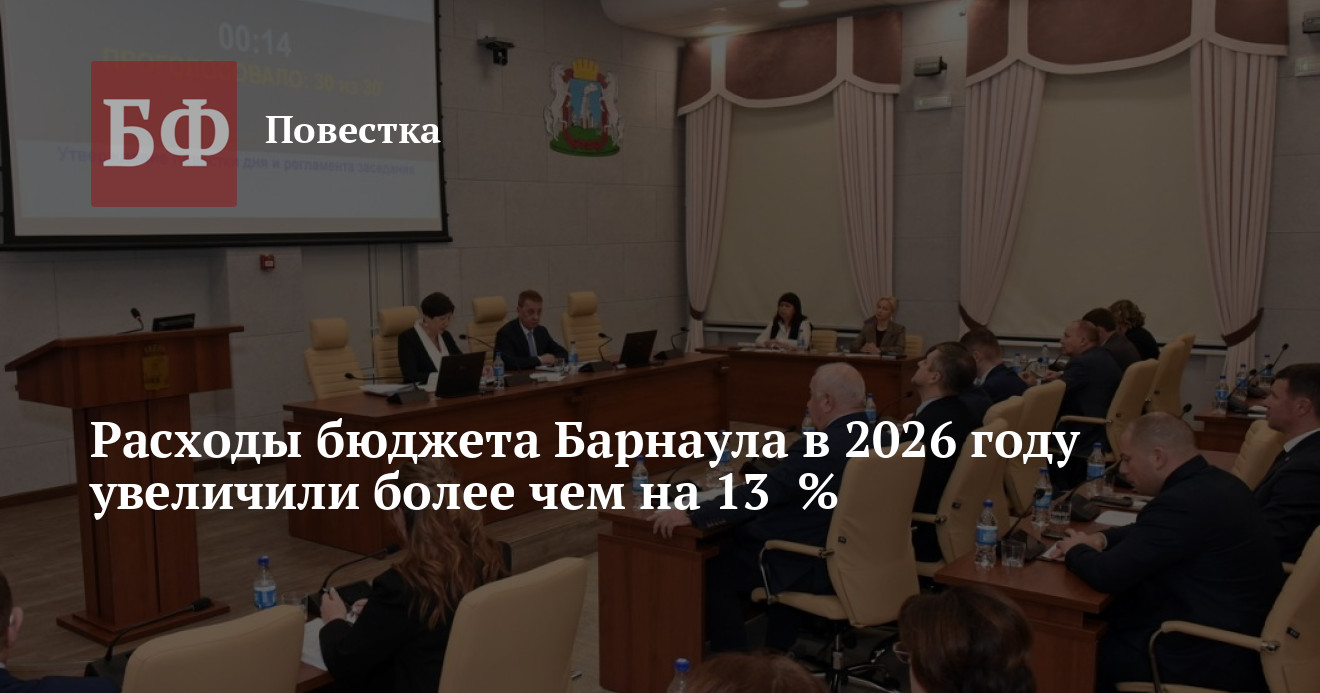 5 декабря депутаты Барнаульской гордумы единогласно приняли бюджет муниципалитета на 2026 год. Планируется, что расходы города в следующем году составят 35,2 млрд рублей, что на 13 % больше, чем в первоначальной версии бюджета 2025 года. Об этом сообщили в мэрии.
