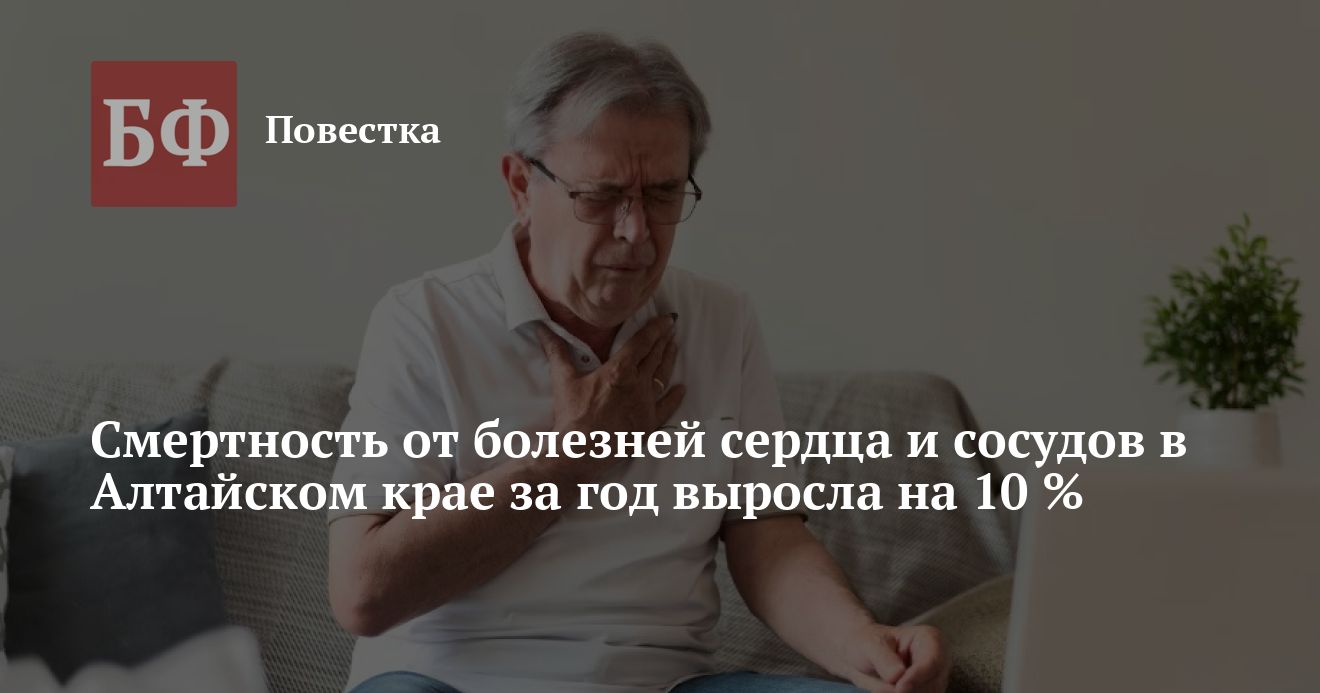 В 2024 году в Алтайском крае серьезно увеличилась смертность от болезней системы кровообращения - в сравнении с 2023 годом показатель вырос на 10 %. При этом лидирующая роль в структуре смертности по данному виду по-прежнему принадлежит ишемической болезни сердца. В связи с этим правительство региона утвердило краевую программу по борьбе с сердечно-сосудистыми заболеваниями, согласно которой, к 2030 году основные показатели должны заметно улучшиться.