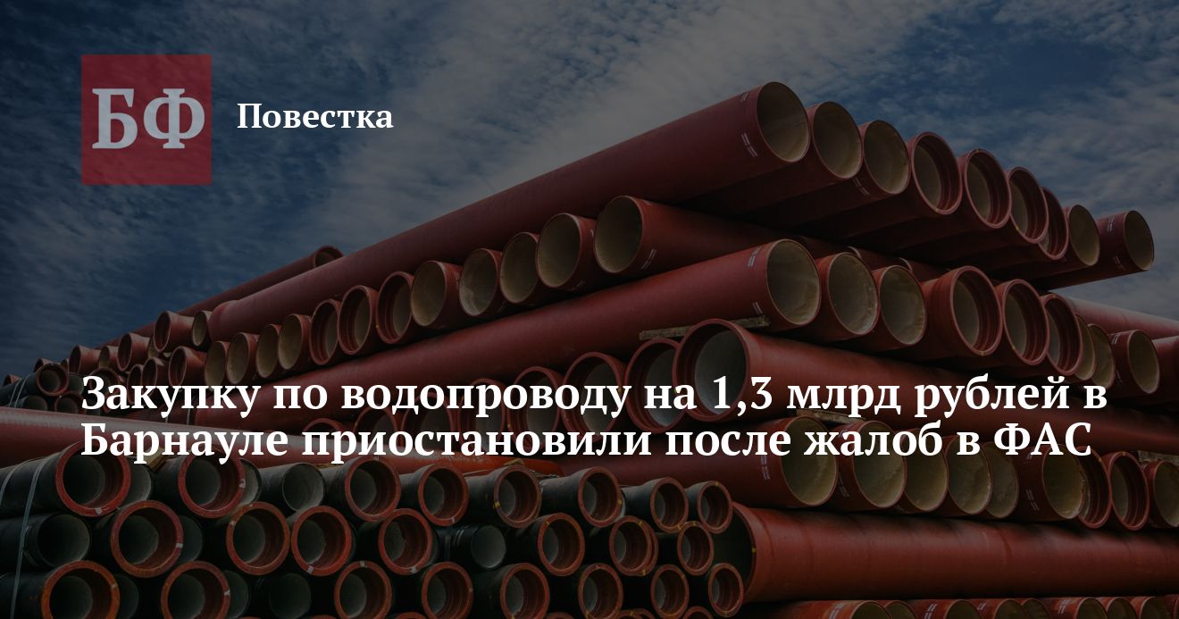 Закупка по определению подрядчика реконструкции водопровода в центре Барнаула, на которую выделили почти 1,3 млрд рублей, вызвала шквал жалоб, адресованных Федеральной антимонопольной службе России. Часть из них ФАС признала обоснованными, при этом выдала только одно предписание в связи с тем, что закупочная комиссия неправомерного отклонила заявку одного из участников. В настоящее время торги приостановлены, сообщается на сайте госзакупок.