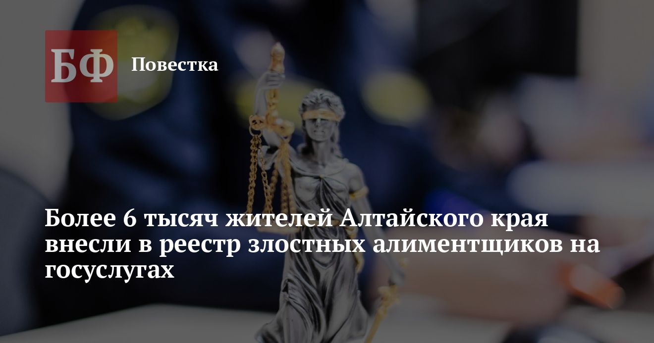 В России на портале госуслуг заработал реестр злостных неплательщиков алиментов. В Алтайском крае в нем состоит более 6 тысяч граждан, сообщили «Банкфаксу» в пресс-службе ГУ ФССП по региону.