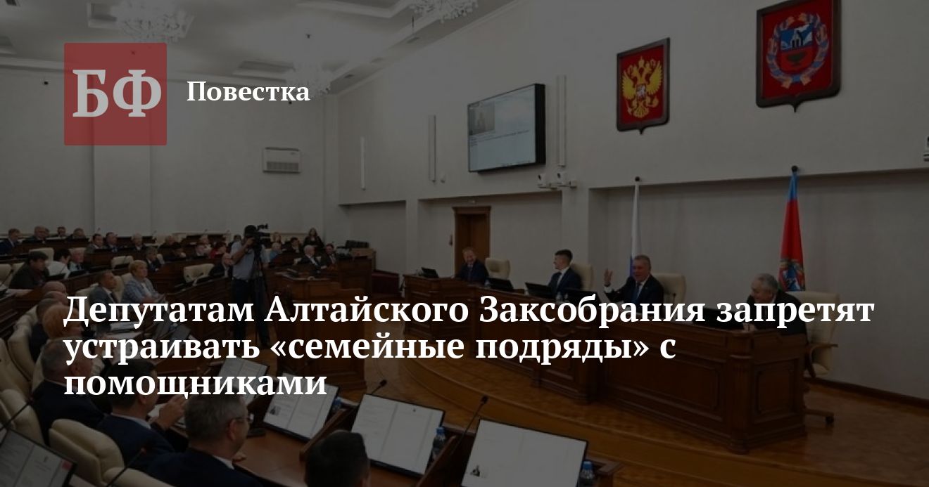 Парламентарии намерены внести изменение в закон Алтайского края о статусе депутата Алтайского Заксобрания. Если поправки примут, то помощником депутата не сможет быть гражданин РФ, состоящий в близком родстве или свойстве (родители, супруги, дети, братья, сестры, а также братья, сестры, родители, дети супругов и супруги детей) с депутатом АКЗС. Примечательно, что закон начнет действовать со дня начала работы нового созыва. При этом среди представителей нынешнего состава Заксобрания, по данным источников, «семейные подряды» в рядах помощников действующих законотворцев могут работать.