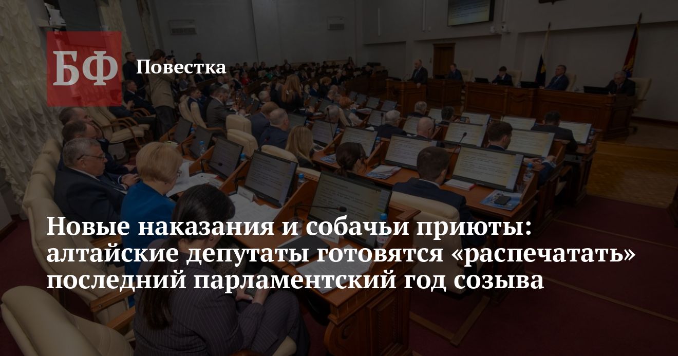 29 января состоится первая в этом году сессия депутатов Алтайского Заксобрания, завершающих через несколько месяцев работу в нынешнем созыве. Среди основных вопросов повестки - ужесточение наказаний за различные административные нарушения, введение обязанности для аграриев уведомлять о применении пестицидов на полях, а также обращение к правительству РФ о выделении участков для строительства приютов для бездомных животных.