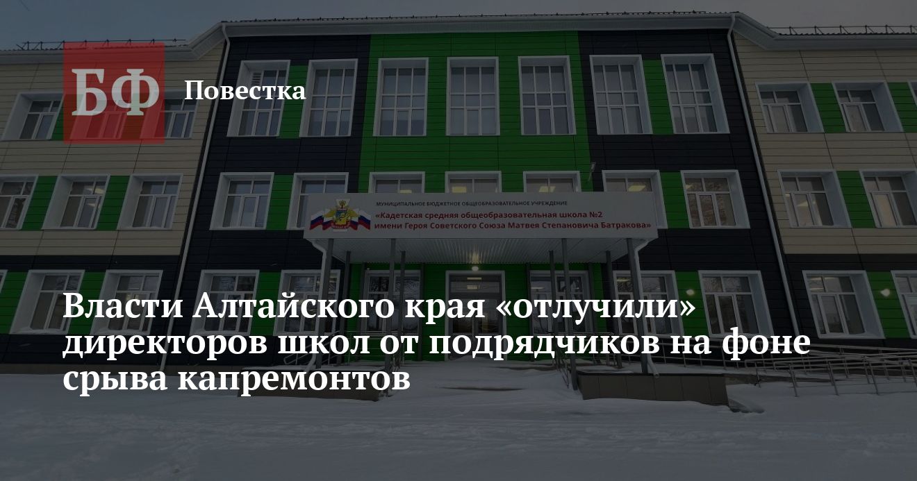 Зампред правительства Алтайского края Юрий Абдуллаев заявил, что школы больше не будут выступать заказчиками капитального ремонта, а вместо них эту роль возьмут на себя чиновники. Такая «новация» в числе прочих мер призвана усилить контроль за проведением работ на фоне многочисленных срывов, сообщил вице-губернатор в ходе пресс-конференции 28 января.