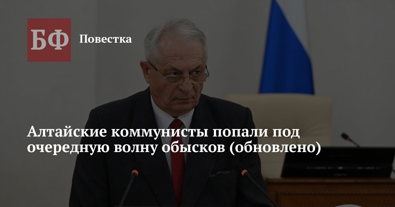 Утром 5 февраля силовики провели обыски у заместителя председателя Алтайского Заксобрания, члена фракции КПРФ Юрия Кропотина и ряда других коммунистов. Об этом в своем Telegram-канале сообщила персек крайкома, депутат Госдумы Мария Прусакова. По данным источников «Банкфакса», это очередной этап разбирательства по делу о депутатских помощниках.